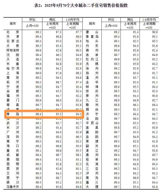 10月20日,國(guó)家統(tǒng)計(jì)局發(fā)布2025年9月份70個(gè)大中城市商品住宅銷售價(jià)格變動(dòng)情況,9月,70個(gè)大中城市中,各線城市商品住宅銷售價(jià)格環(huán)比下降,同比降幅繼續(xù)呈收窄態(tài)勢(shì)。青島方面,9月青島新建商品住宅銷售價(jià)格環(huán)比下降0.5%,環(huán)比降幅擴(kuò)大,同比下降1.3%,同比降幅已連續(xù)11個(gè)月收窄;二手住宅銷售價(jià)格環(huán)比下降0.6%,同比下降4.5%,環(huán)同比降幅均較前一個(gè)月收窄。